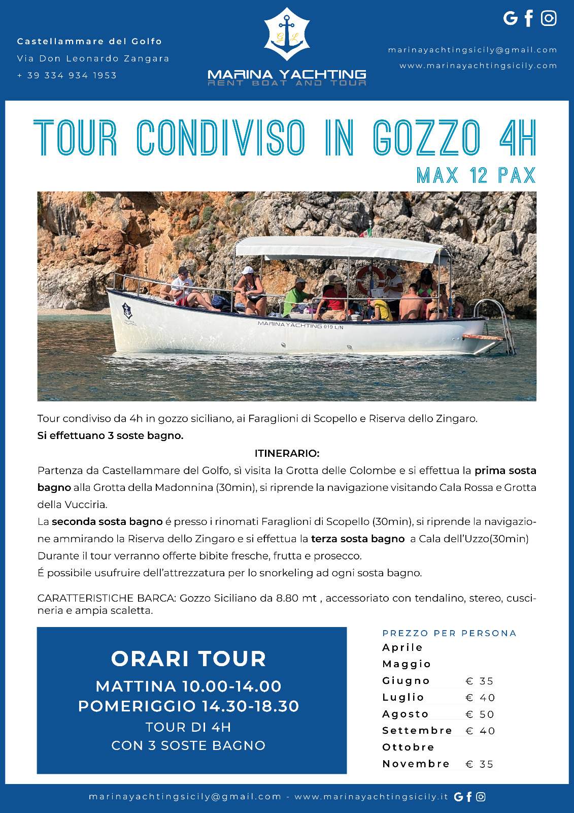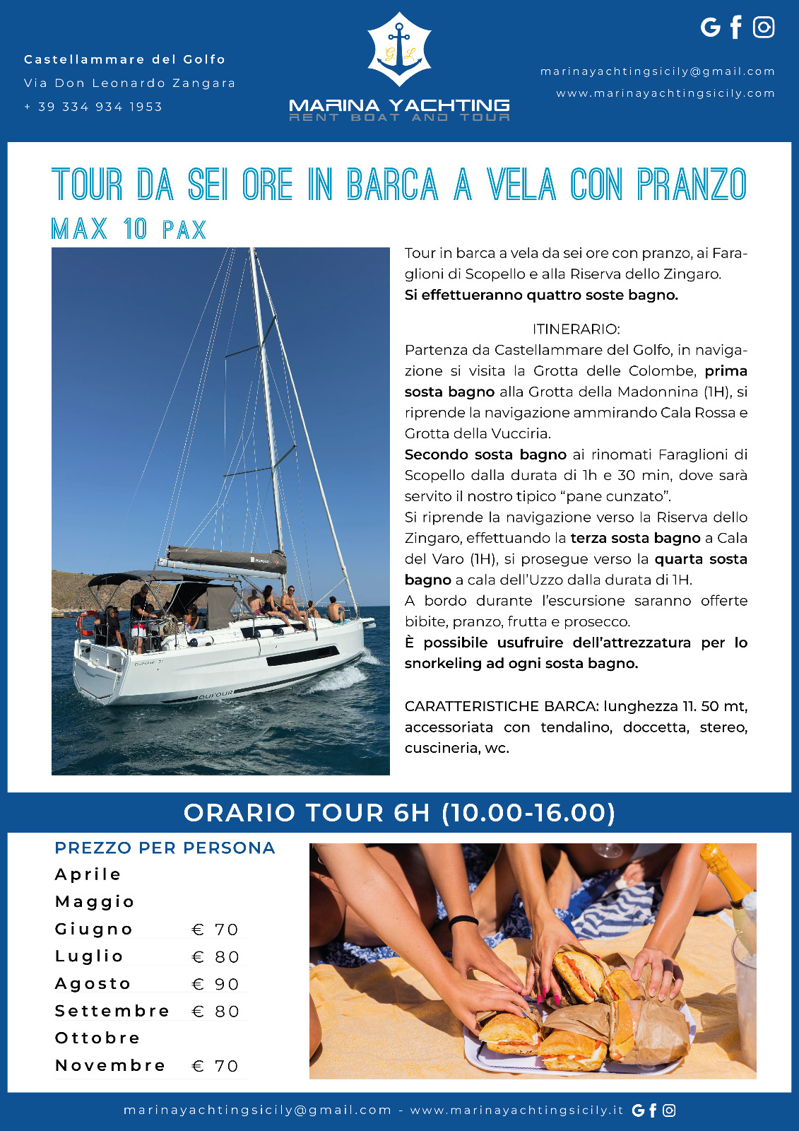 Se desideri concederti una giornata intera tra mare, relax e bellezza, questo è il tour perfetto: 6 ore di navigazione, soste bagno nelle acque più belle della costa, panorami spettacolari e il piacere di un pranzo tipico siciliano e bibite fresche servite a bordo, per vivere il mare con tutto il comfort che meriti.